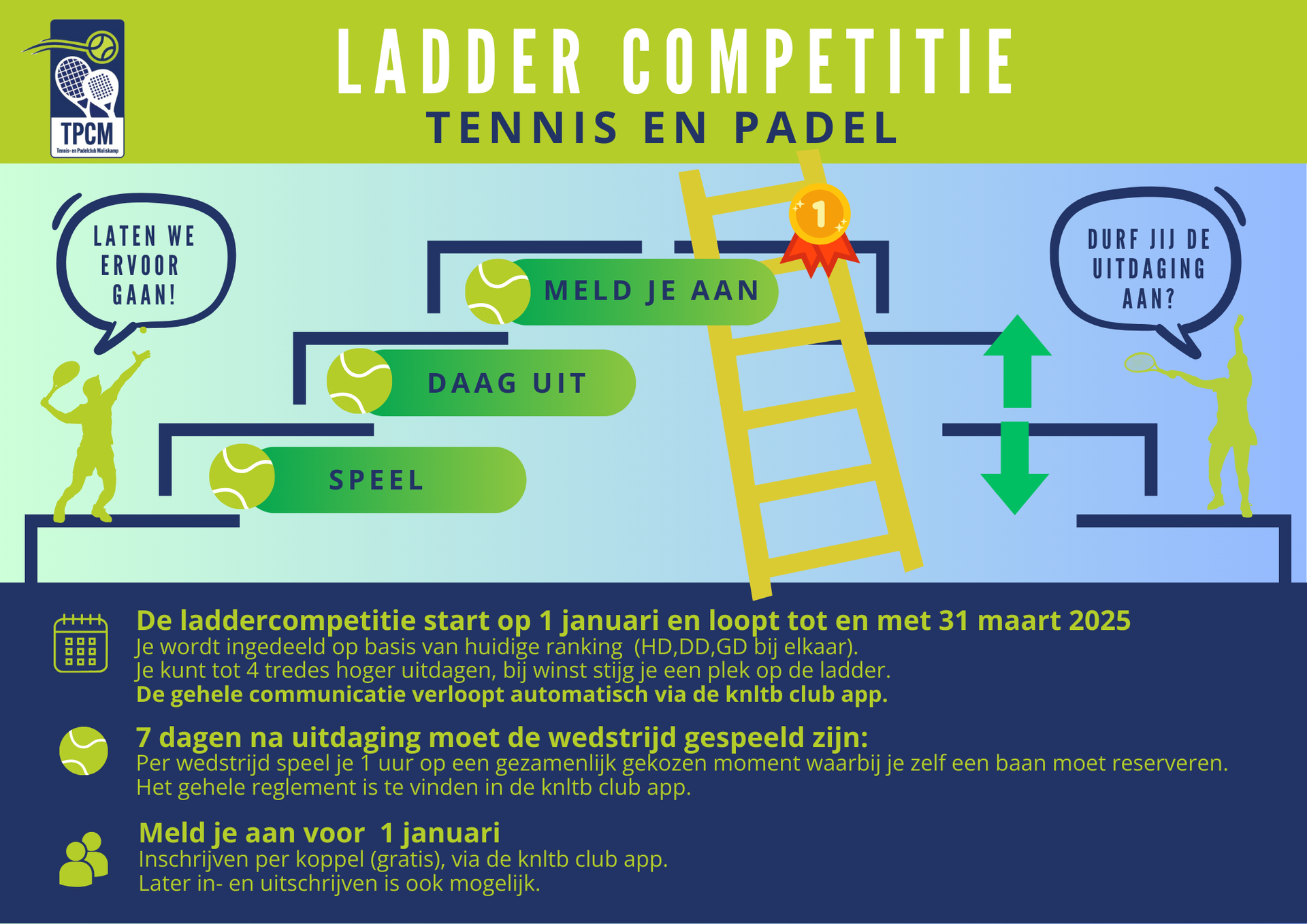Beste leden, de laddercompetitie gaat vanaf 1 januari weer starten, alle uitdagingen en uitslagen dienen in de clubapp te worden ingevuld. Lees de uitleg hieronder goed door en maak ook van deze ladder weer een groot succes. Mochten er vragen zijn, dan horen wij dit graag.