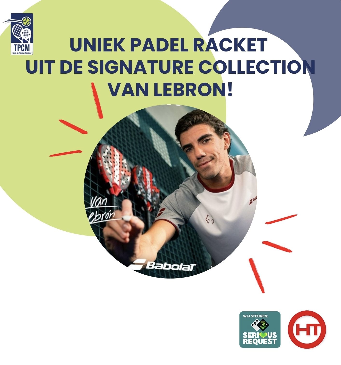 HT Sports Rosmalen schenkt TPC Maliskamp voor hun 24 uurs Tennis en Padel Challenge een gesigneerd Babolat padel racket uit de signature lijn van Juan Lebron. Geen replica, maar het echte werk (voorzien van certificaat van echtheid). Kom langs op 19 en/of 20 december 2025 en bekijk het racket van dichtbij, voel de sfeer en breng je bod uit. De volledige opbrengst gaat naar Serious Request.